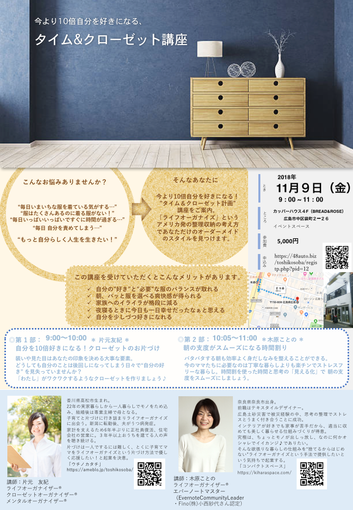 講座「今より10倍自分を好きになる!タイム&クローゼット」開催のお知らせ
